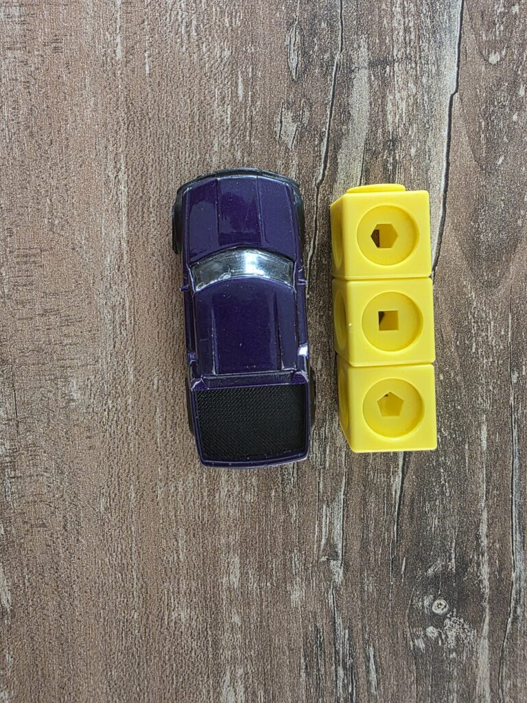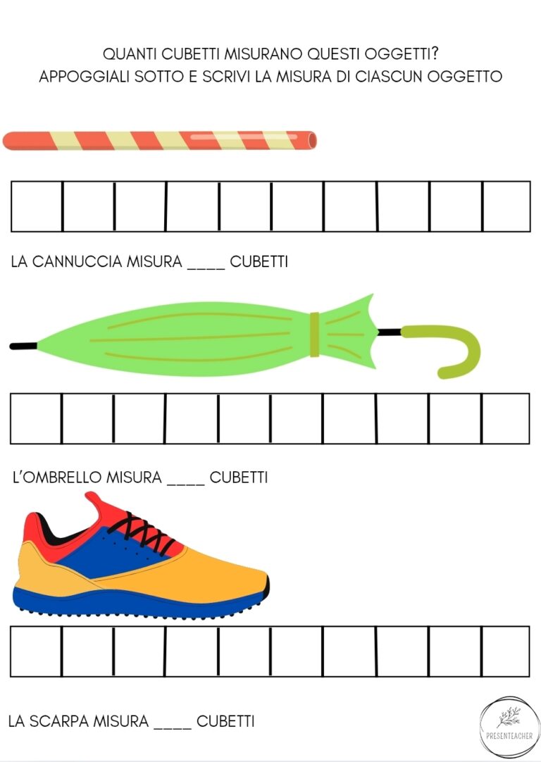 Si possono scegliere con la classe degli oggetti a disposizione e misurarli con i cubetti: sicuramente usciranno delle riflessioni interessanti come le più dimensioni di un oggetto (quale devo misurare?). Per esempio, se i bambini vorranno misurare la spugna della lavagna si chiederanno se misurare la lunghezza, la larghezza o l’altezza: lasciamoli sperimentare e ragioniamo insieme.