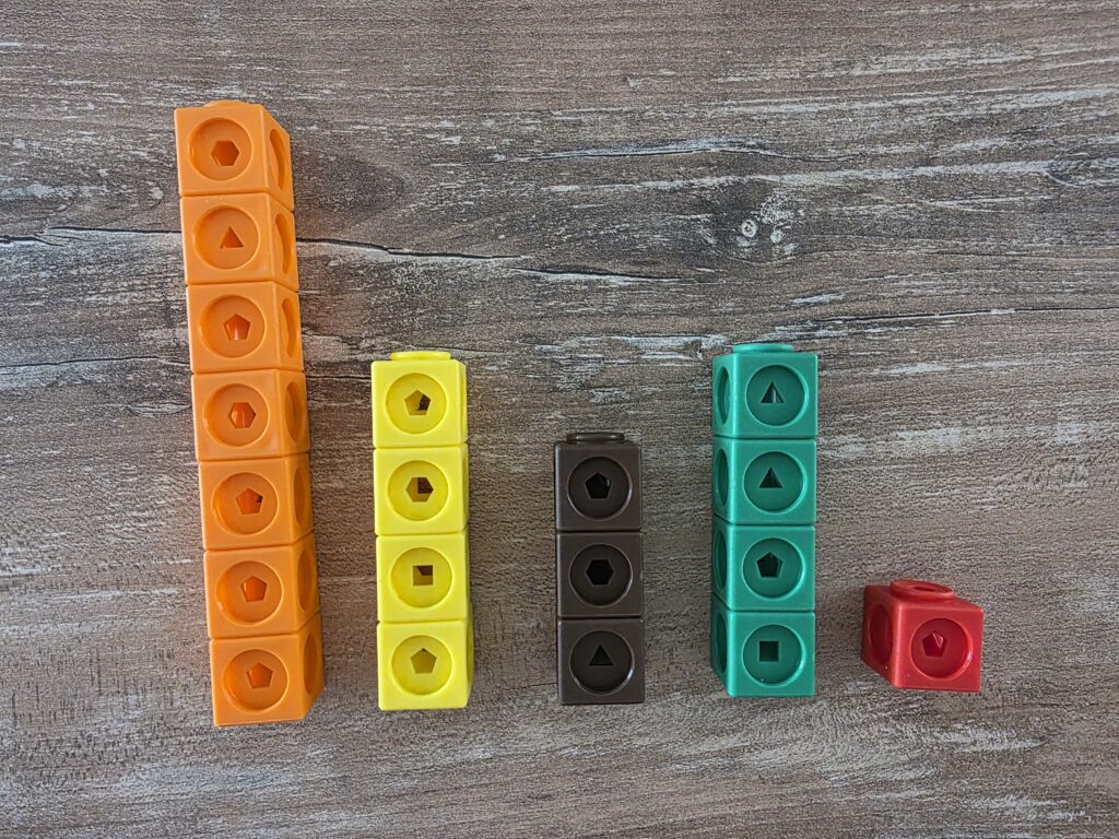 Il passaggio seguente potrebbe poi essere quello di chiedere di ordinare dei numeri dal più piccolo al più grande e viceversa: all’inizio magari i numeri da 1 a 10, poi soltanto alcuni numeri, per esempio, 3 – 7 – 2 – 5 – 8. I bambini prima dovranno costruire le torri, poi metterle in ordine di altezza a seconda di come richiesto.