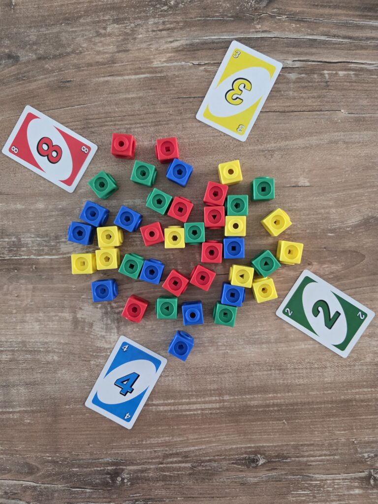 Disponete i bambini in gruppi (da 2 a 4 direi), mettete al centro del tavolo tutti i cubetti gialli, rossi, verdi e blu. Poi, distribuite ai bambini le carte da UNO (senza quelle speciali): i bambini dovranno girare una carta alla volta e prendere tanti cubetti quanti sono quelli indicati dalla carta, ovviamente del medesimo colore. Vince chi raccoglie più cubetti.