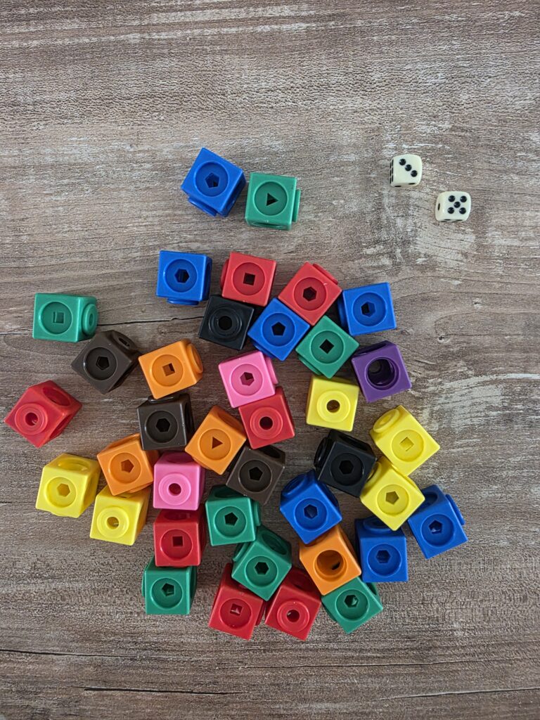 Per complicare un po’ di più l’attività illustrata nel punto precedente, i bambini possono lanciare uno o più dadi e, dopo aver sommato i numeri usciti, pescare tanti cubetti quanti quelli indicati dalla somma del numero (o perché no, dal prodotto o dalla differenza, a seconda di quello che vogliamo andare a potenziare)