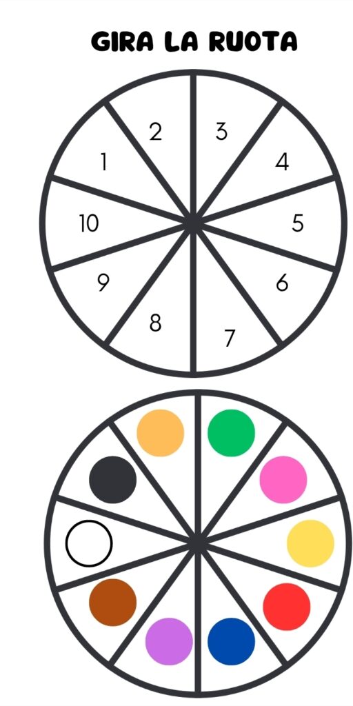 Per allenare il conteggio, possiamo proporre ai bambini due semplici ruote (che puoi scaricare direttamente a questo link) una con i numeri e un’altra con i colori.