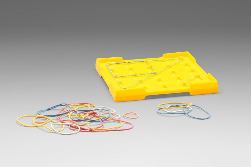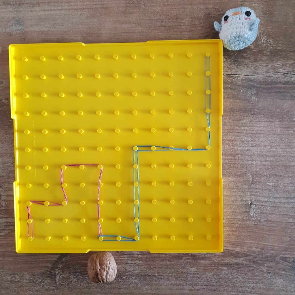 - il mini Geopiano a due facce, piccolino, ma con una faccia a griglia quadrata e l’altra a “cerchio” per poter costruire poligoni e angoli;