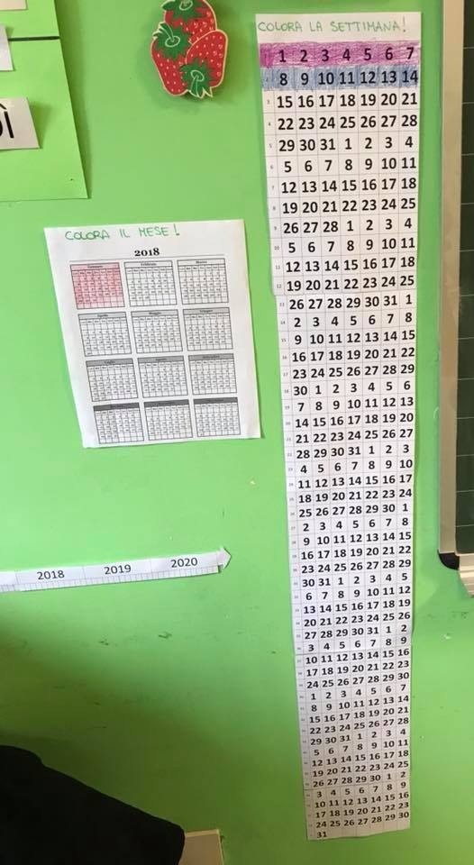 Quando eravamo in classe seconda avevamo inoltre svolto un ricco lavoro sul calendario (che trovate documentato qui) e avevamo costruito vari strumenti che gli incaricati dovevano tenere aggiornati: la striscia delle settimane da colorare, la striscia dei mesi e quella degli anni, il calendario a strappo, le bottiglie del “fluido del tempo passato e futuro” e i calendari “ieri, oggi e domani”. In quel caso gli incaricati avevano un po’ più da fare!