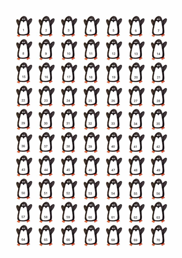 Quindi abbiamo appeso in classe un calendario nuovo e dedicato, normalissimo (per renderlo ancora più a tema ne ho acquistato uno con le immagini dei pinguini!) e ho preparato questa scheda con 365 pinguini numerati