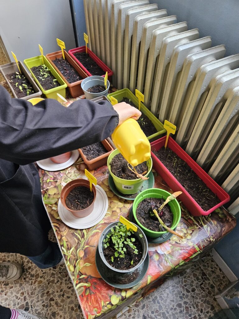 Normalmente devono dare qualche scaglia di mangime ai pesciolini dei due acquari e foglie fresche agli insetti stecco ed eventualmente ai bruchi. E poi si recano in corridoio davanti all’aula e innaffiano le piantine.