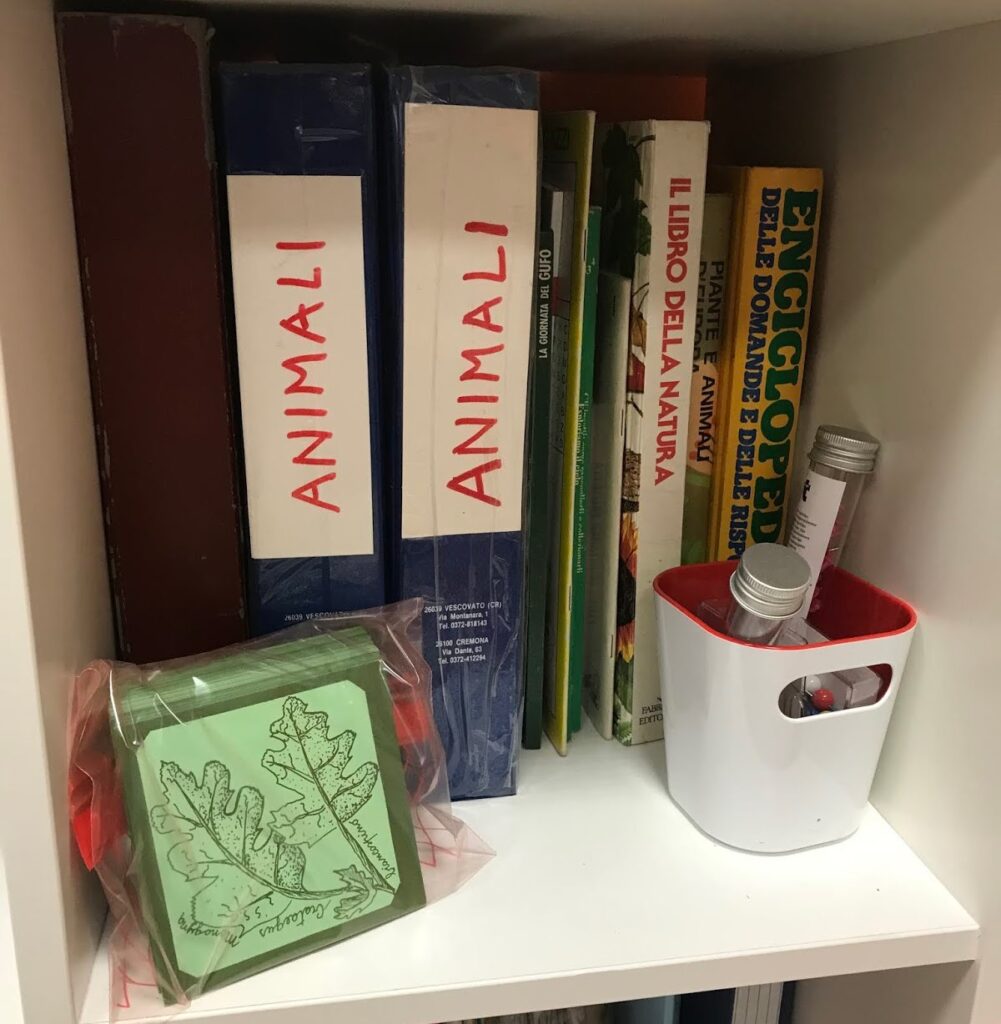 Due bambini sono gli incaricati ricercatori e hanno questo compito: in classe abbiamo una piccola biblioteca di libri scientifici (alcuni mooooolto vecchi, ma sempre super interessanti e ricchi di belle immagini) che riguardano vari argomenti: animali, piante, corpo umano, insetti, universo, minerali e rocce e così via.