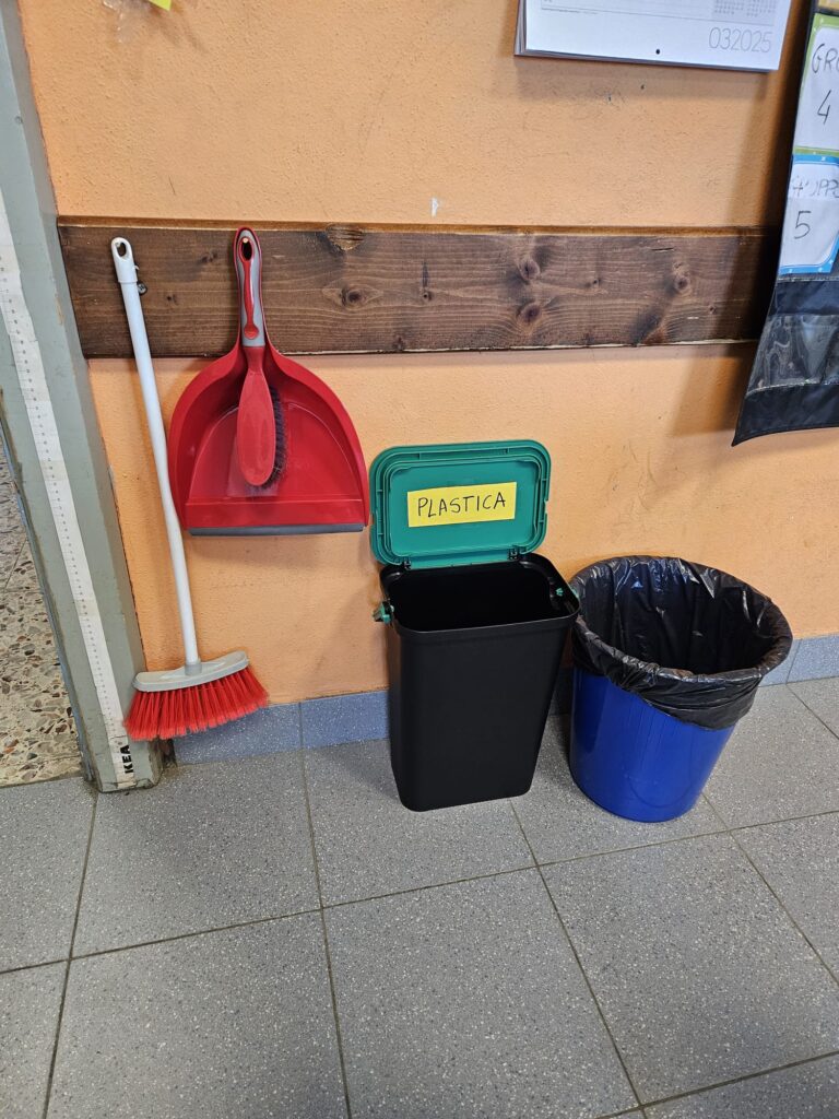 In classe abbiamo un piccolo angolo all’ingresso dove abbiamo appeso una mini scopa, una paletta, una spazzola e lo scottex, proprio accanto ai cestini della raccolta differenziata.