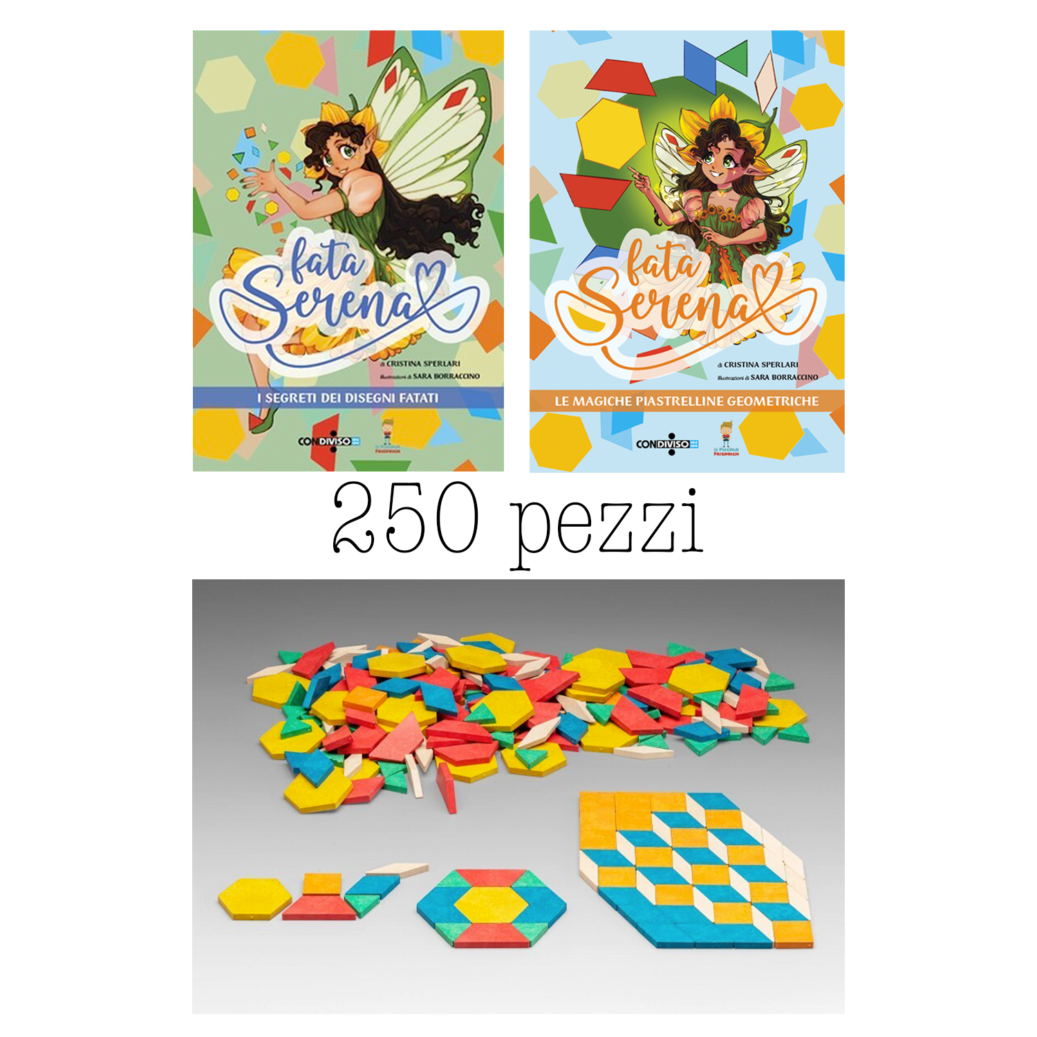 Due libri illustrati che raccontano le avventure di Fata Serena, una dolce fatina che ama proporre alle sue amiche tante sfide matematiche utilizzando delle magiche piastrelline geometriche. Uno storytelling che accompagnerà i bambini di tutte le classi in diverse avventure, proponendo attività geometriche, divertenti problemi, sfide logiche, giochi di probabilità , riflessioni su angoli, proprietà delle figure e trasformazioni geometriche, attraverso attività ludiche e stimolanti.