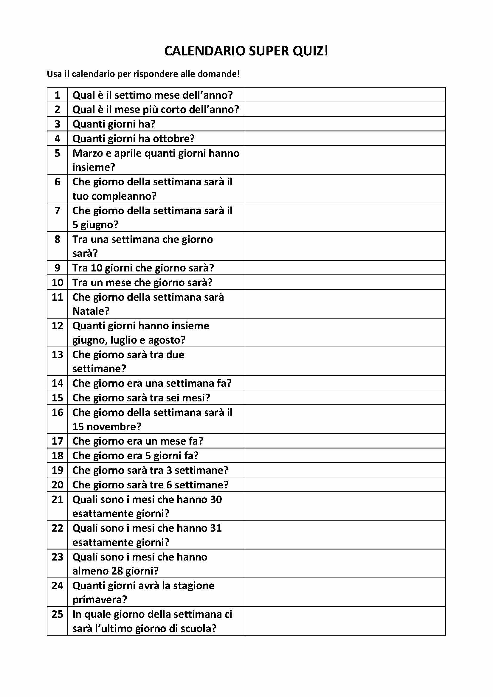 Una scheda con tante domande curiose per stimolare i bambini ad osservare e analizzare un calendario, scoprendone il funzionamento e le caratteristiche. Utile sia per lavorare in matematica (problem solving) che in storia. Dalla classe seconda.