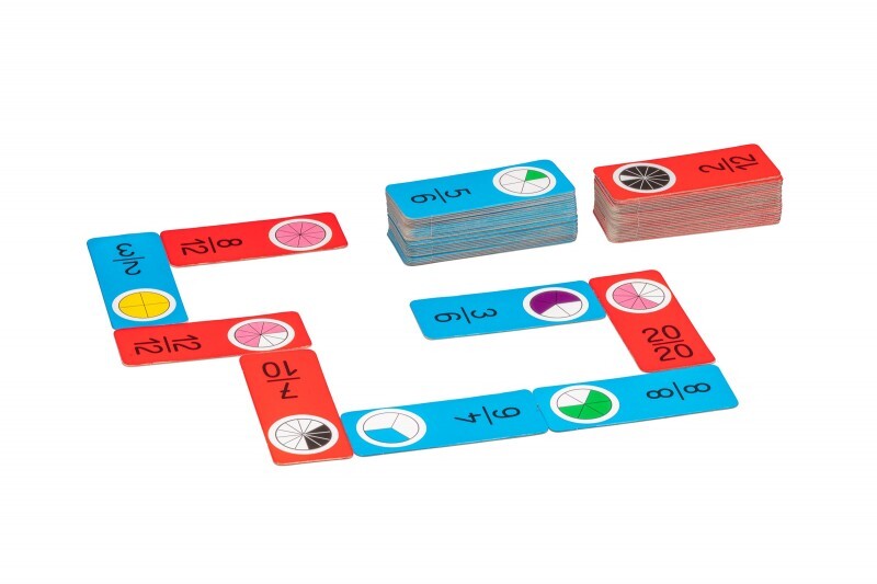 Il gioco richiede di riconoscere e abbinare le frazioni più comuni. E’ composto da 60 carte domino (30 blu = gioco facile; 30 rosse = gioco difficile).