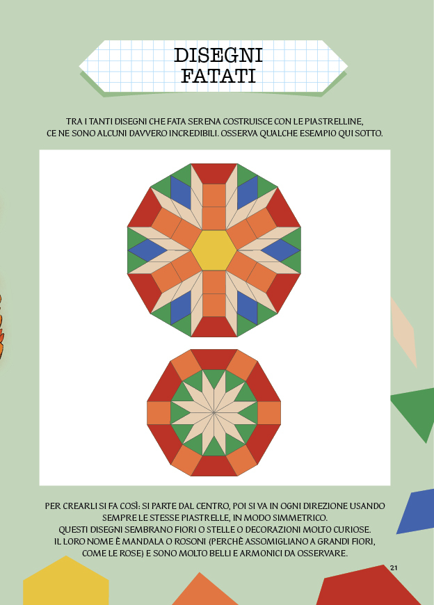 Un libro illustrato che racconta le avventure di Fata Serena, una dolce fatina che ama proporre alle sue amiche tante sfide matematiche utilizzando delle magiche piastrelline geometriche. Uno storytelling che accompagnerà  i bambini di tutte le classi in diverse avventure, proponendo attività  geometriche, divertenti problemi, sfide logiche, giochi di probabilità  , riflessioni su angoli, proprietà  delle figure e trasformazioni geometriche, attraverso attività  ludiche e stimolanti.