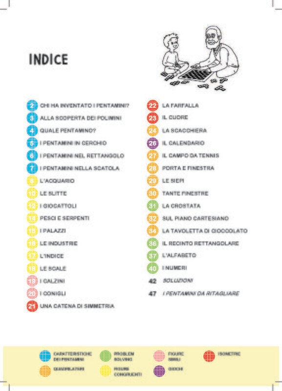 Un quaderno operativo ricco di sfide coinvolgenti, di difficoltà  crescente, da risolvere con i pentamini, figure composte da cinque quadrati con almeno un lato in comune. Tante figure da comporre per esplorare, attraverso il gioco, diversi concetti matematici e per stimolare le abilità logiche e di problem solving.