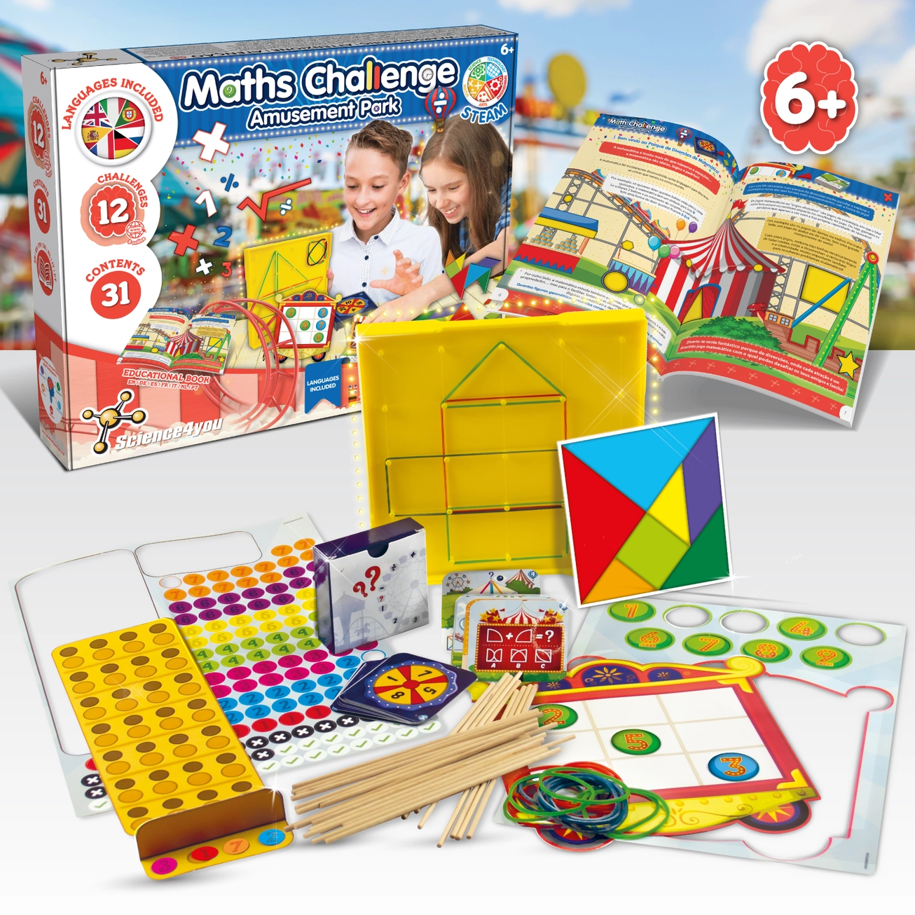 Con Maths Challenge Amusement Park, i bambini possono imparare da ognuna delle 12 sfide che combinano divertimento e apprendimento, risvegliando la curiosità e l’interesse per le sfide matematiche. Gioco educativo con 12 sfide – Crea forme diverse e impara le figure geometriche con una geoboard ed esplora altre sfide con Tangram, Mastermind e molte altre. Giocattoli ideali per bambini dai 6 anni in su – Giocattolo perfetto per i bambini che amano i giochi e le sfide matematiche. 31 Contenuti inclusi – Geoboard; elastici; lavagna e numeri; Mastermind; Tangram; schede di sfida matematica; bastoncini di legno e molto altro. Giocattolo educativo STEM – Science4you mira a sviluppare giocattoli educativi che combinano il divertimento con l’istruzione, incoraggiando la curiosità e la sperimentazione. Manuale di istruzioni in 7 lingue: Inglese, italiano, francese, portoghese, spagnolo, tedesco e olandese.