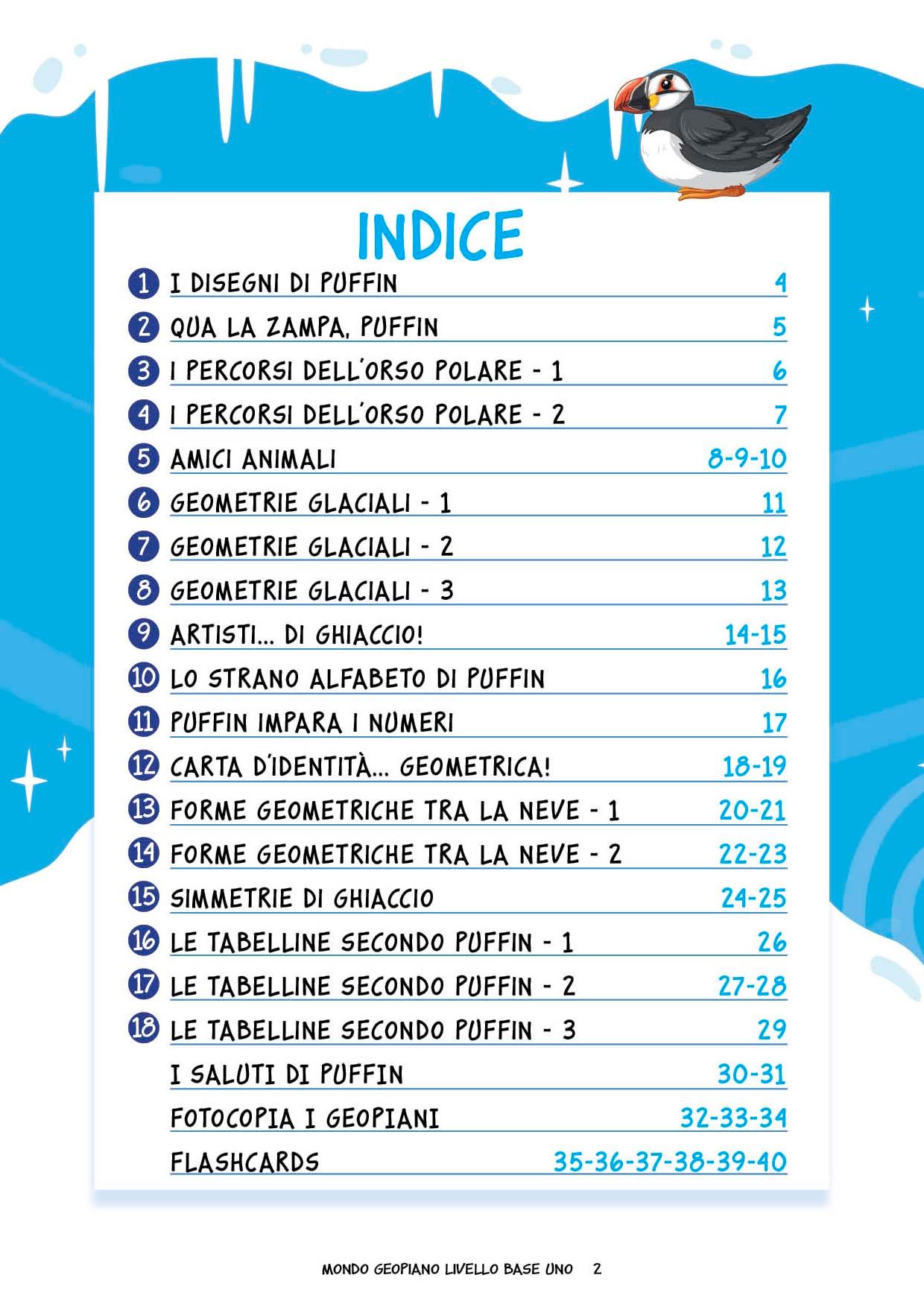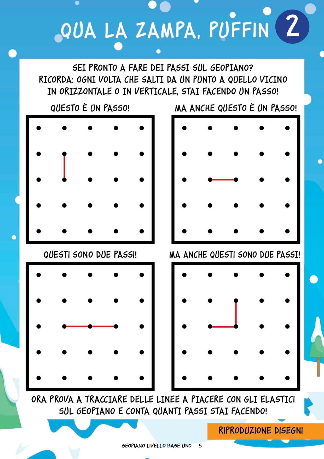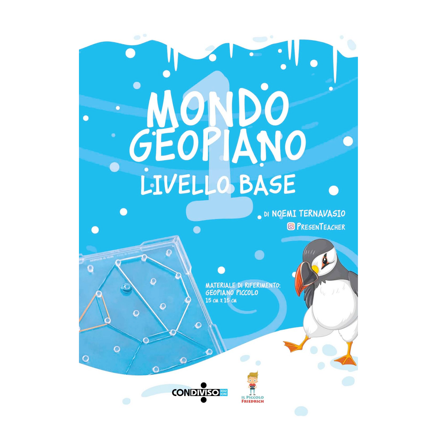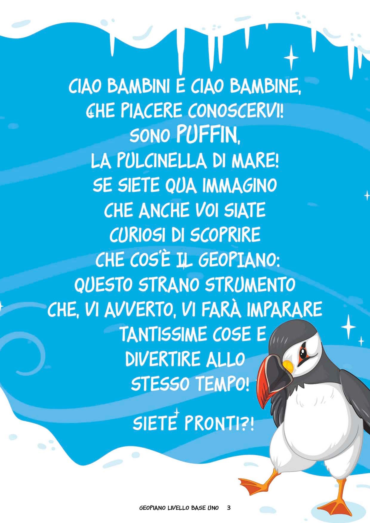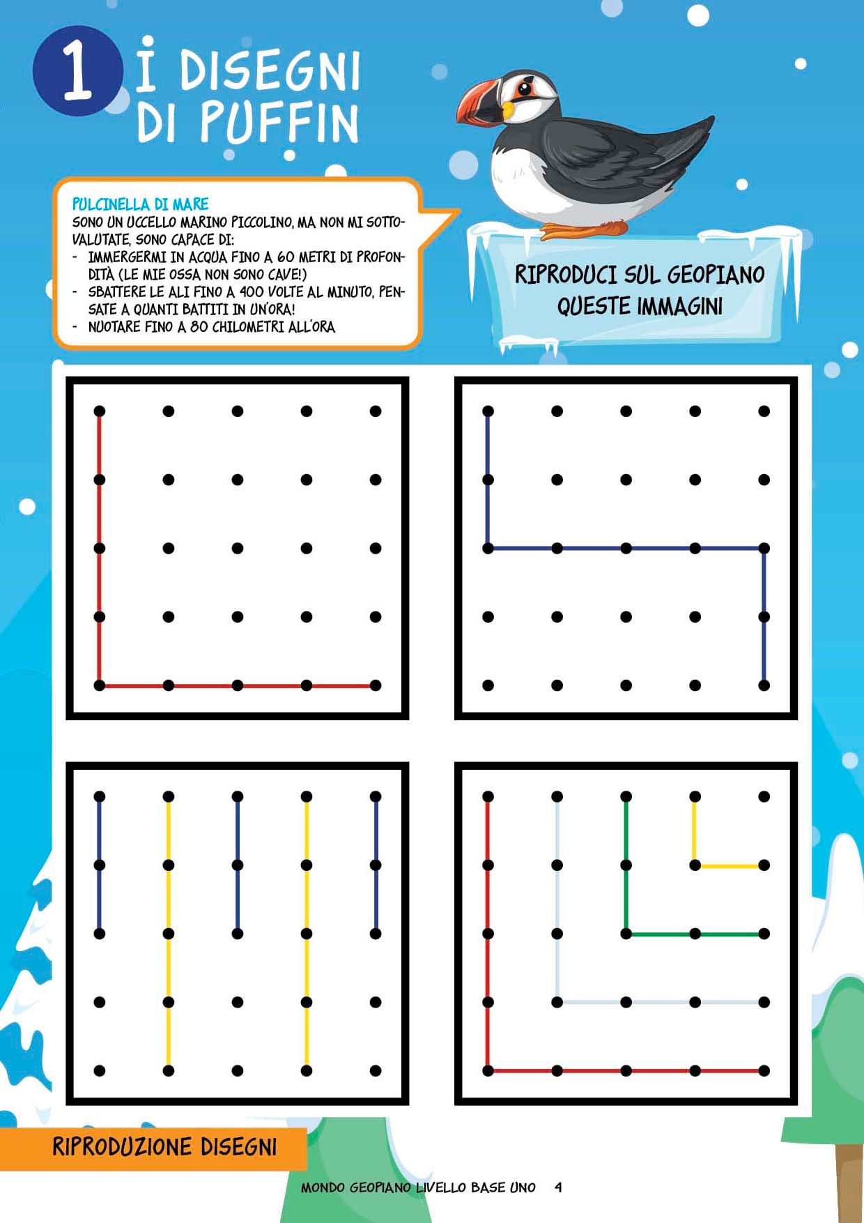 Un viaggio tra i gelidi ghiacci artici alla scoperta del Geopiano in compagnia di Puffin, una pulcinella di mare che svelerà ai bambini tanti segreti per iniziare a lavorare con questo incredibile strumento. Comprende tante attività graduali su vari argomenti matematici e delle flashcards da ritagliare per creare dei disegni geometrici sul Geopiano.
