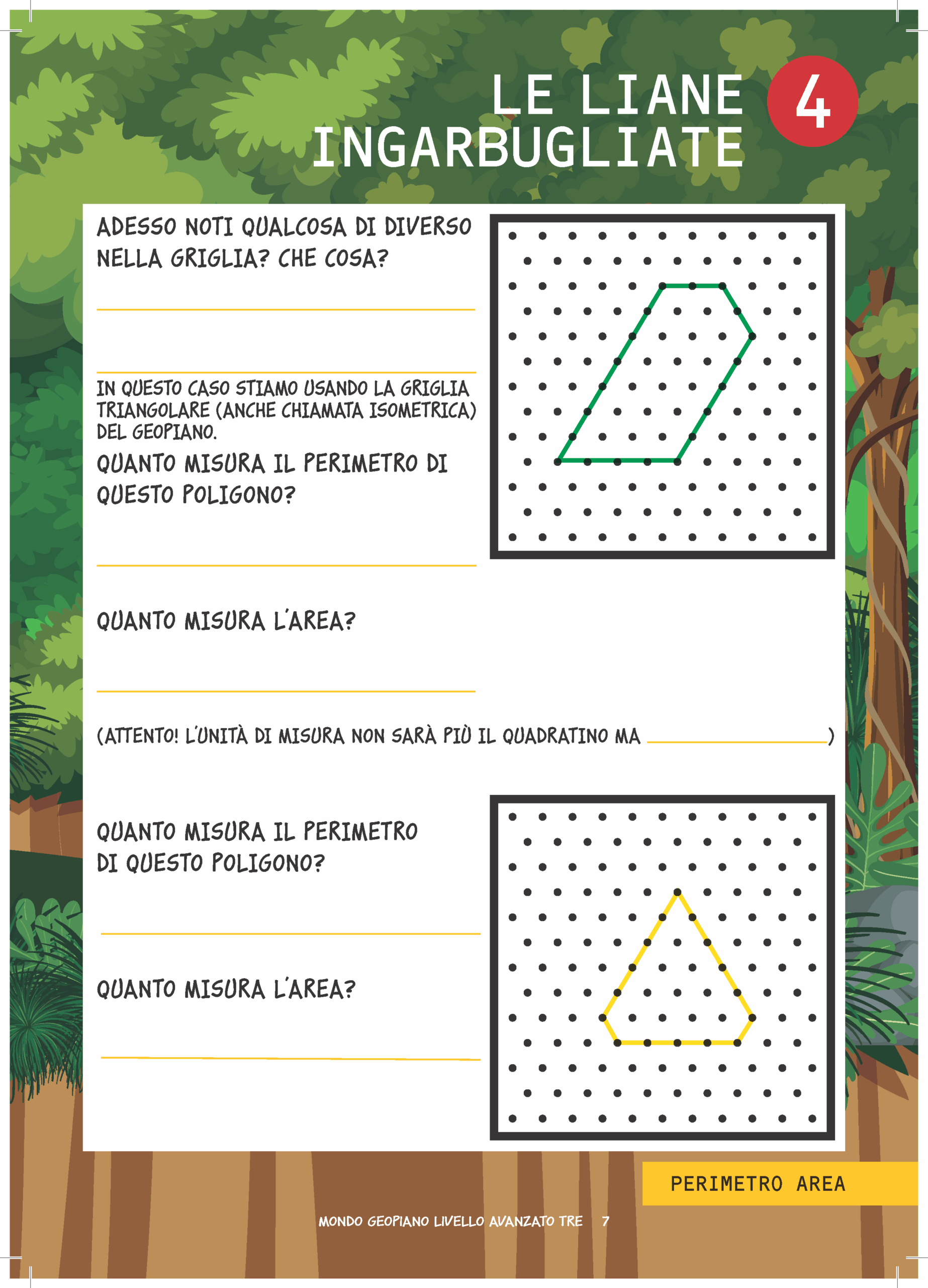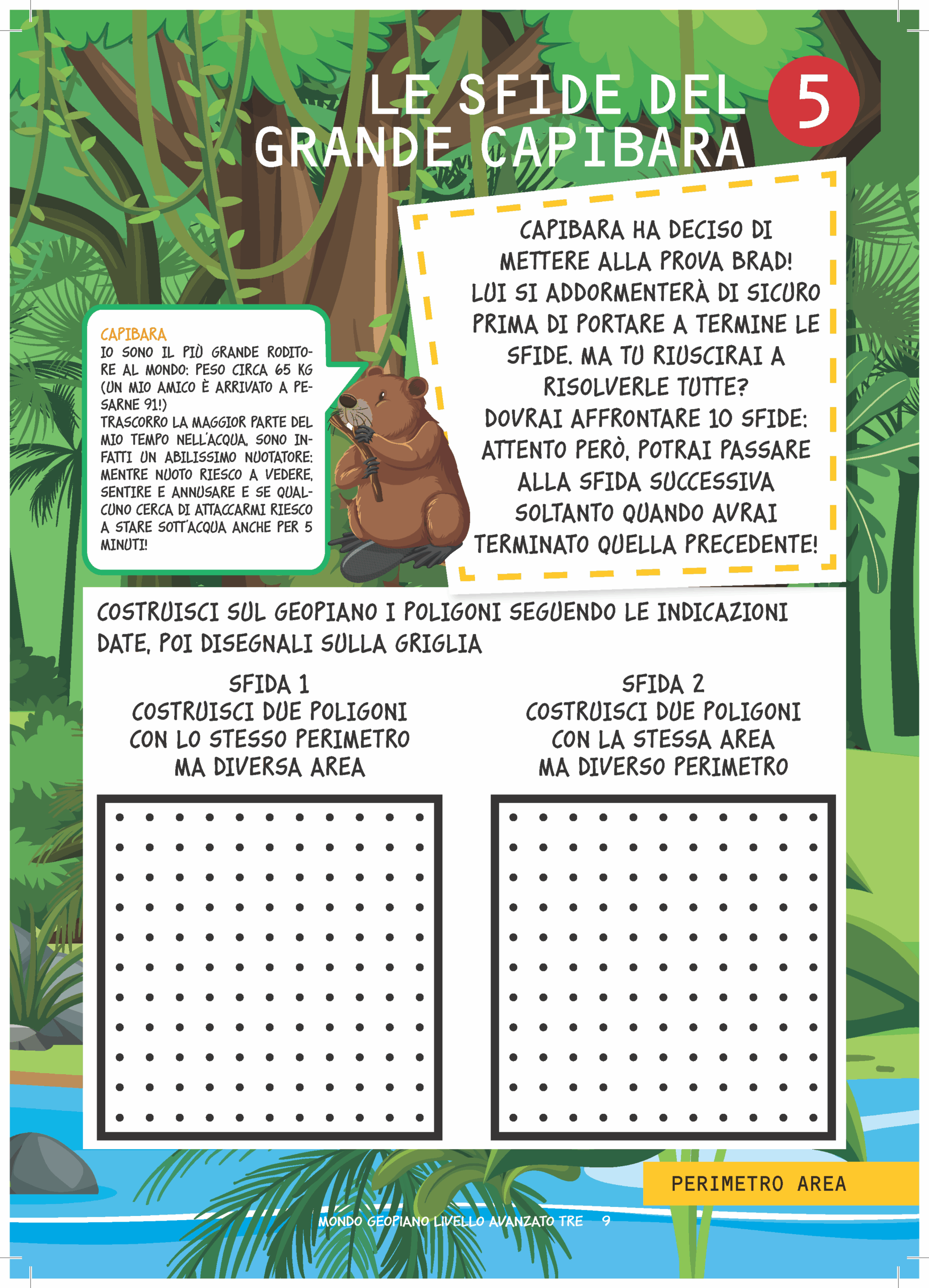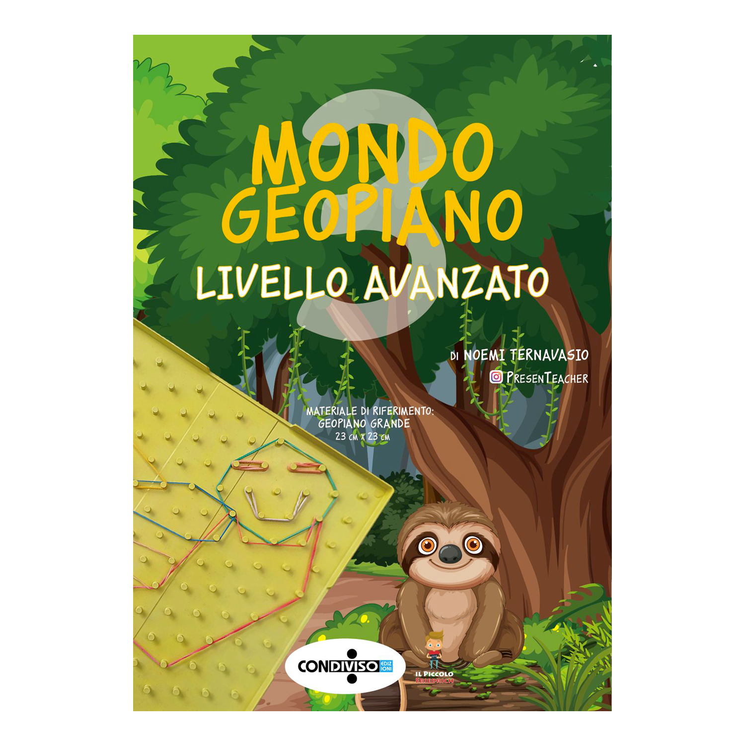 Un misterioso viaggio nella giungla in compagnia di Brad, un simpatico e dolce bradipo, e dei suoi amici che accompagneranno i bambini alla scoperta di concetti come perimetro, area, trasformazioni geometriche e tanto altro ancora, attraverso giochi con gli elastici sul Geopiano. Comprende tante attività graduali su vari argomenti matematici e delle flashcards da ritagliare per creare dei disegni geometrici sul Geopiano.