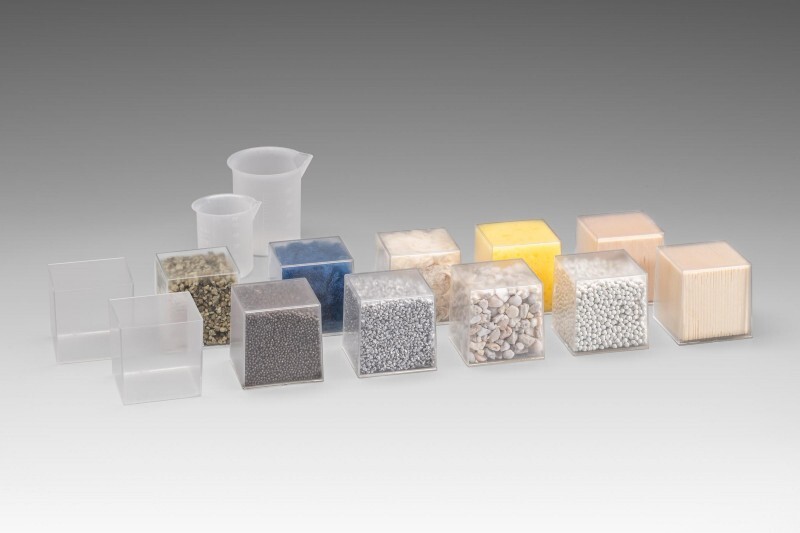 Set di 10 cubi – riempiti con vari materiali come piume, lana, pietra pomice, ghiaia, legno di balsa, abete rosso, schiuma, plastica, alluminio e ferro – e 9 cubi vuoti (5 x 5 x 5 cm). 2 misurini con capacità  50 e 100 ml.